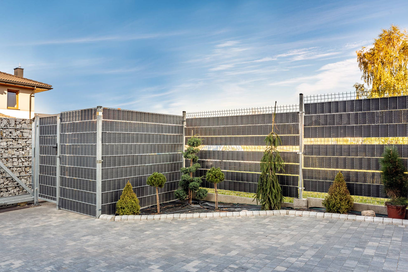 Ein Doppelstabmattenzaun ohne Sichtschutz ist funktional – mit unseren Rattan-Streifen wird er zum echten Hingucker.
